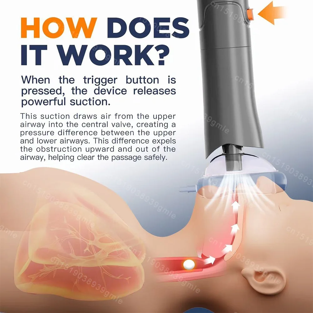 Once the trigger is pressed, the device creates powerful upward suction. This airflow helps generate pressure that moves airway obstructions upward toward the central valve and out of the airway.