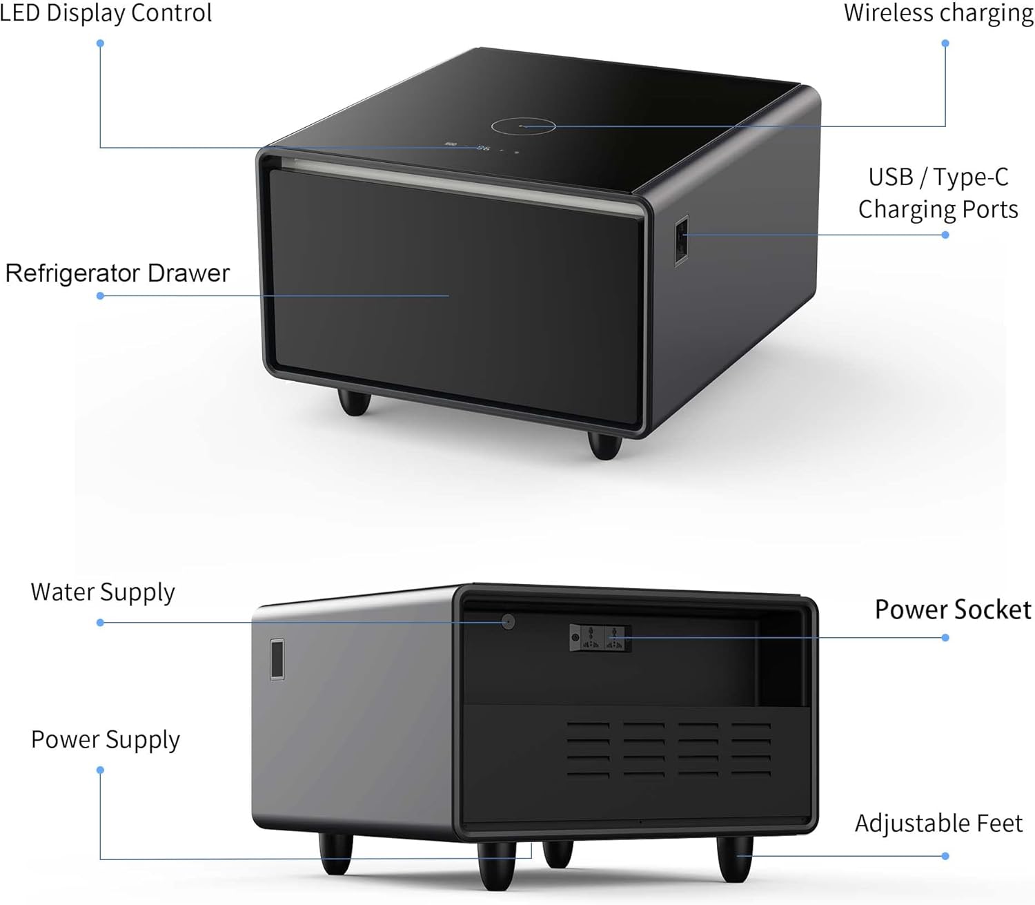 - Smart Nightstand with Integrated Fridge: Keep your beverages, snacks, and fruits perfectly chilled with our smart table that combines side table functionality with a refrigerator. Enjoy peace and quiet with efficient cooling, adjustable from 37-46°F.
